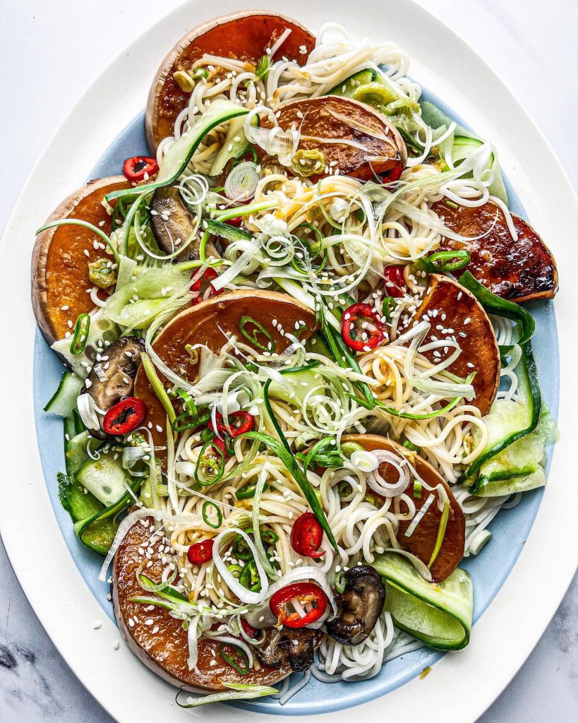 - Spiralize cucumbers into noodles, pat dry with a paper towel.