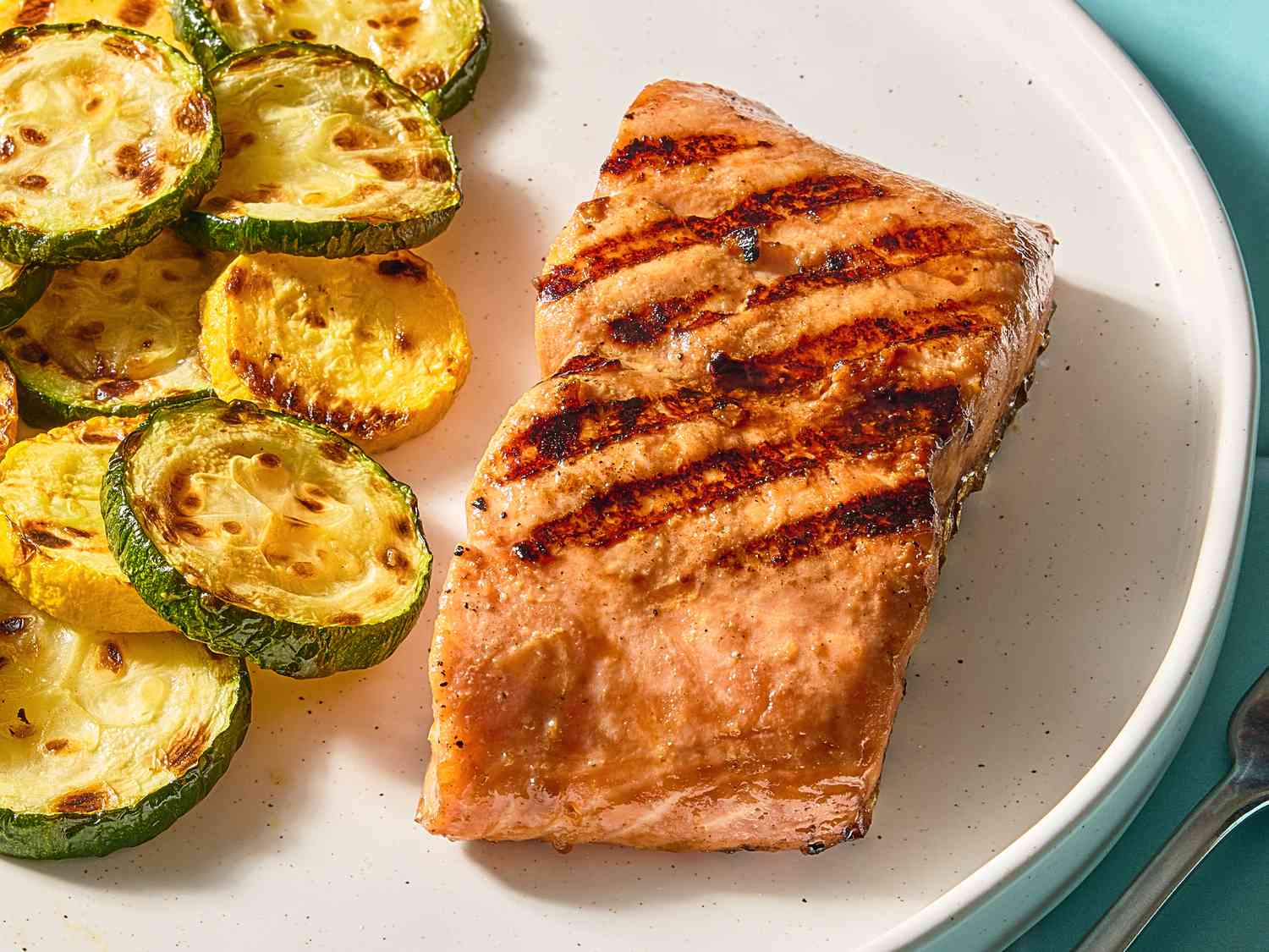 - Grill salmon for 4 minutes per side, basting with marinade.