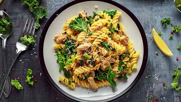 - Drain pasta, reserving some water, and toss with pesto, adding water if needed for sauce consistency.