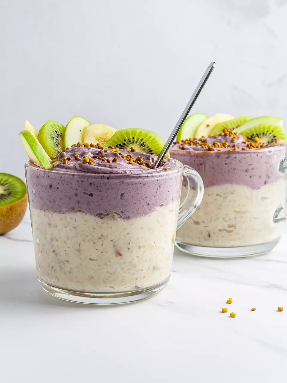 - Combine oats, almond milk, yogurt, maple syrup, and vanilla in a jar.